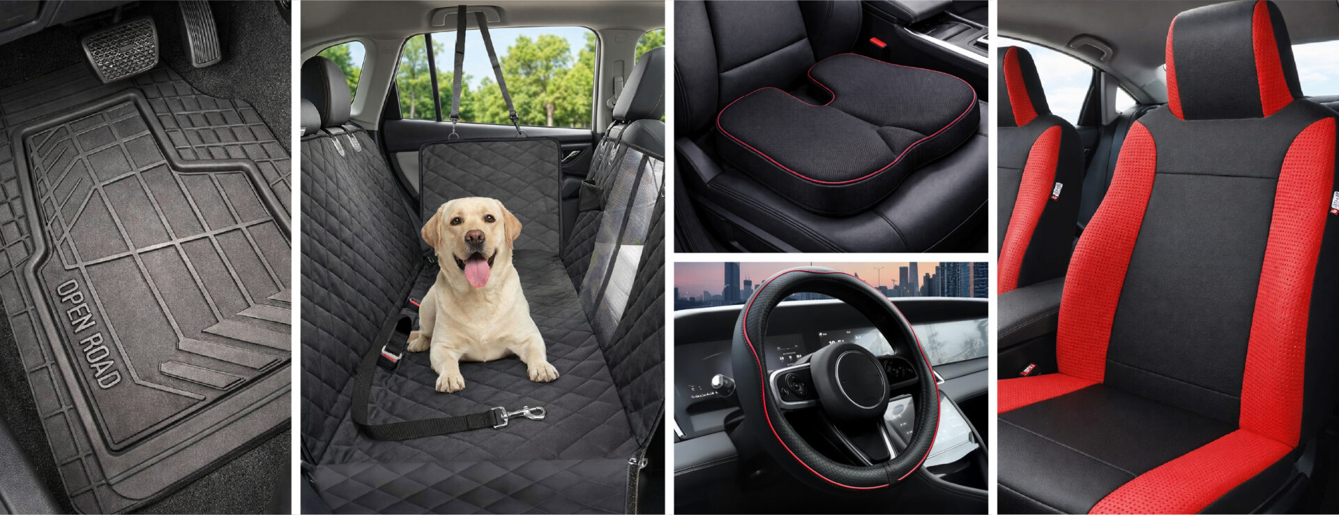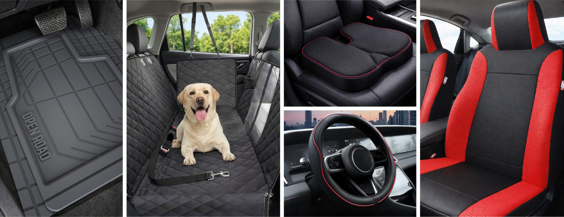 Open Road Car Seat Cover and Steering Wheel Cover Set, Universal Fit Interior Protection, Breathable Material, Black/Red$57.00current price $57.00Open Road Memory Foam Car Seat Cushion, Ergonomic Comfort Seat Pad for Driving, Office, Truck or SUV, Black